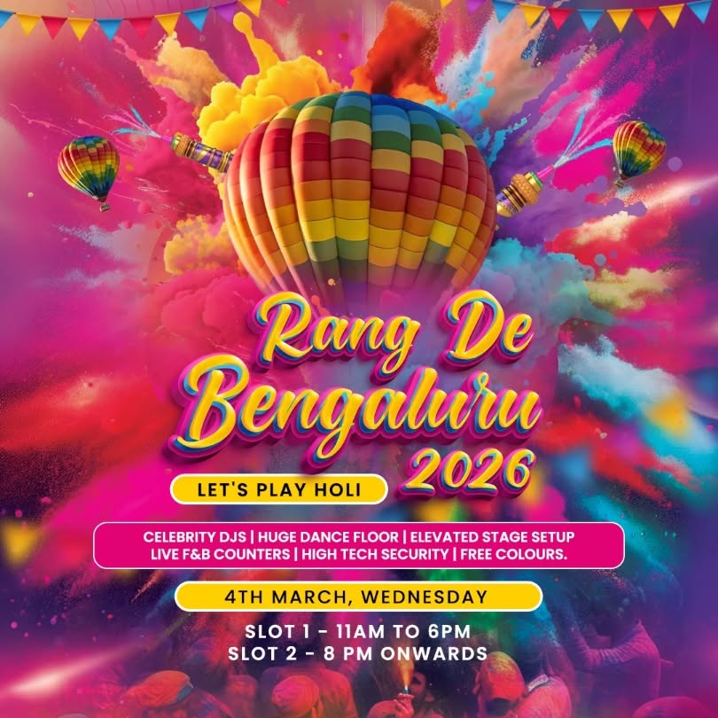 Bengaluru, it’s time to turn up the colour! Rang De Bengaluru 2026 at Skygarden is bringing celebrity DJs, a massive dance floor, live F&B counters, and non-stop festive energy all day long.